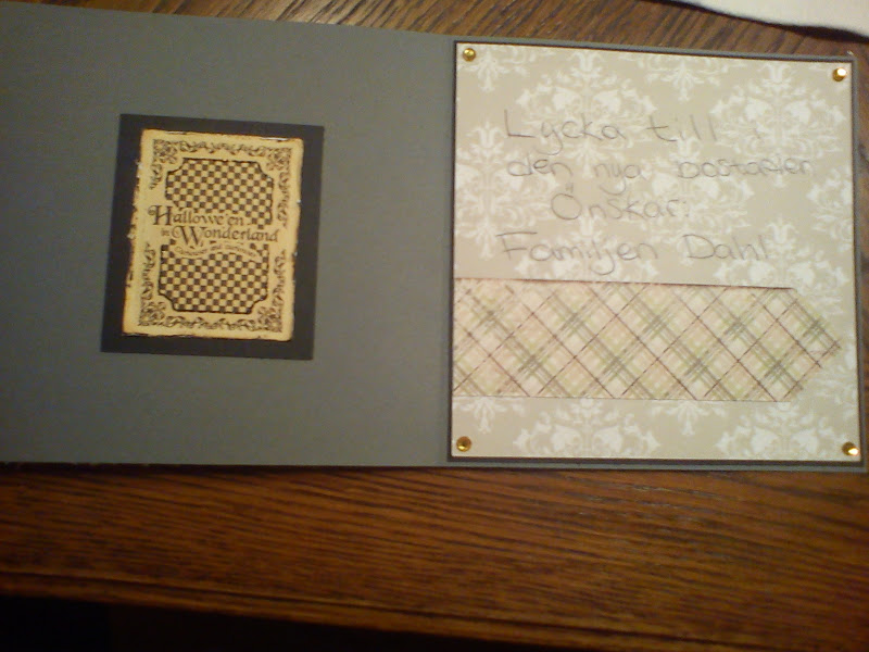 Hälsningen hamna på vänster sida och presentkortet satte jag fast med häftmassa på högrasidan